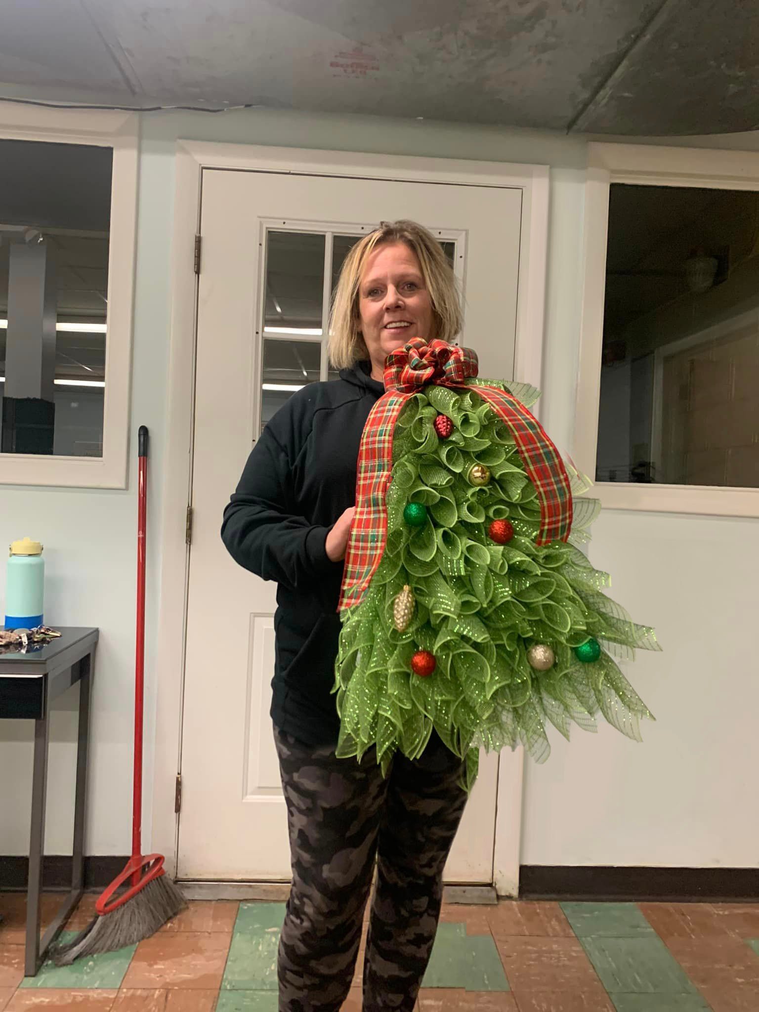The Christmas tree body is made of green polyester burlap netting. The bow topper is red, and green polyester burlap netting. (Red, Green, Gold)Berry accents and a cute bow with the Christmas tree decoration complete the look.