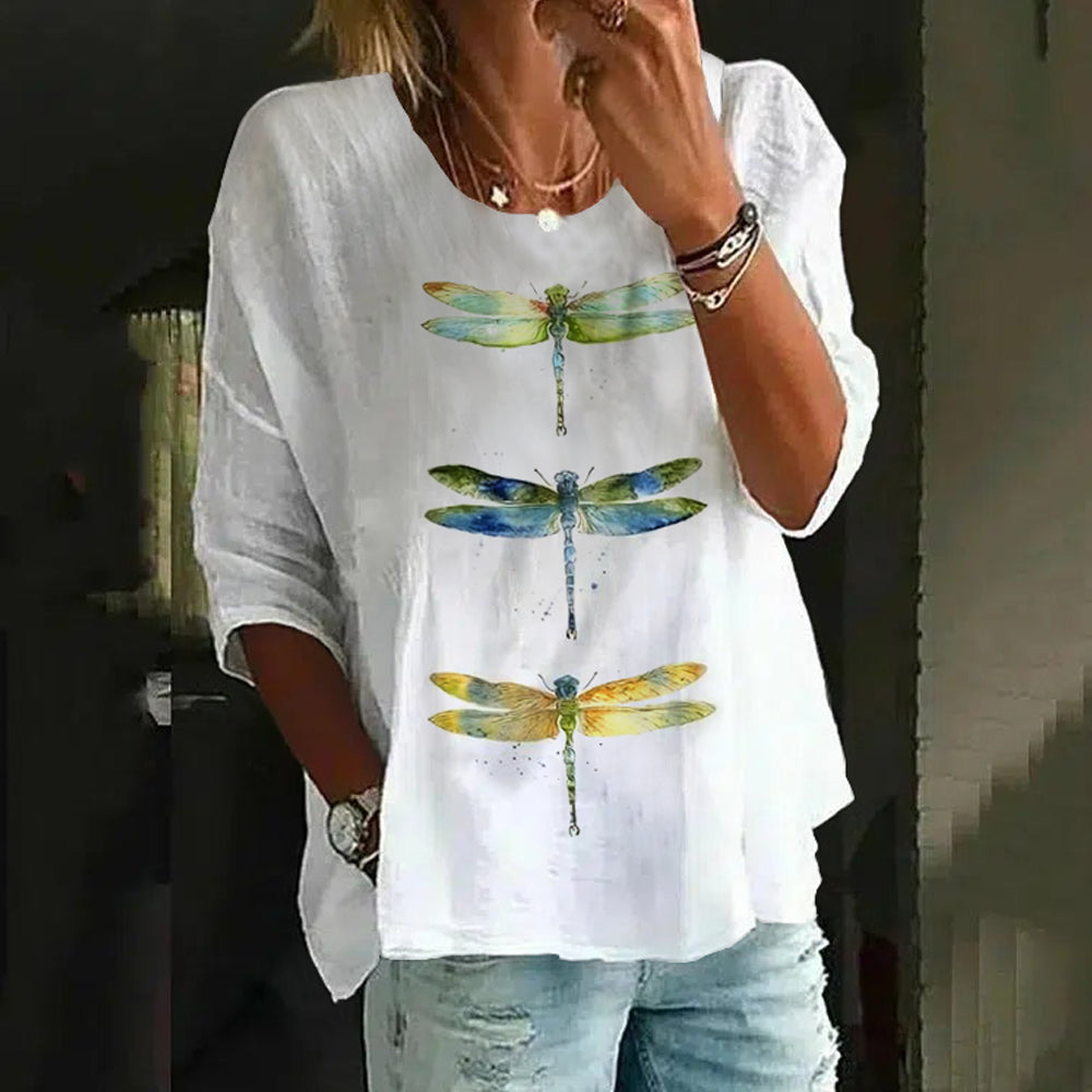 Introducing our Unique Dragonfly Print Round Neck Top. Made from high-quality material, this top features a beautiful and eye-catching dragonfly print that will make you stand out from the crowd. With a comfortable round neck design, it's perfect for any occasion. Elevate your style with this unique top.